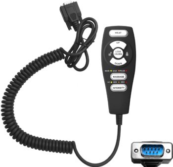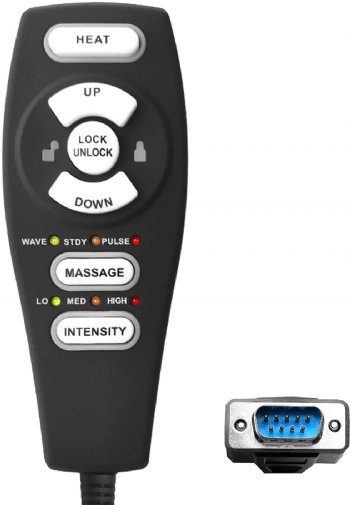 Tranquil Ease lift chair hand control with up/down buttons as well as a button for heat along with buttons for massage mode and intensity. Also features an electronic safety lock button to prevent unintended use. Has 9 pin rectangle shape connection.